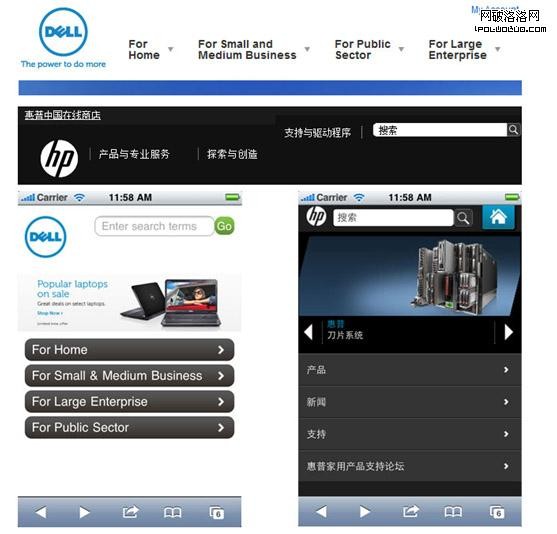 由於移動設備更適合縱向的浏覽方式,PC站點的頂部橫向導航和側邊欄導航在移動端通常轉變為縱向導航。例如下圖dell 和hp的移動版網站設計中,均采用這種轉換方式,較好地完成了導航的遷移。