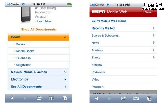 下圖中亞馬遜的導航采用了當前折疊展開的方式而ESPN的則采用了層級導航方式。