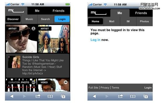 支持HTML5特性的高端機型通常可以實現頁面的局部刷新。通過Tab的應用,導航可以在有限的頁面空間顯示更多的內容。例如 Myspace頂部的導航設計:三個主導航下面各有3-4個二級導航,展現了網站的主要功能。