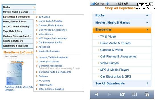 其中第三點往往容易被忽視,亞馬遜的移動版在PC版的基礎上對導航的內容進行了合並和刪減,控制了信息量,使之更適合用戶在在移動終端浏覽。例如將電器&電腦這一條目在移動端拆分為兩個條目(電器、電腦辦公),並使子項目的數目由17條縮減到7條。一定程度上也符合了移動端神奇數字7的原則。