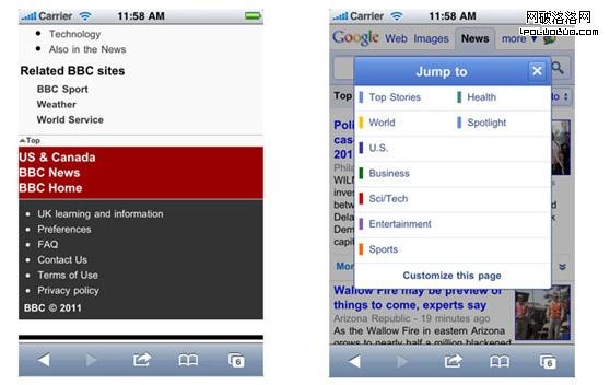 頁內錨點導航是移動終端特有的導航方式之一,它可以使用戶快速到達頁面頂部、底部和相關板塊。例如BBC在底部有返回頂部的快速鏈接TOP,而谷歌新聞則提供了不同板塊之間快速跳轉的錨點導航。