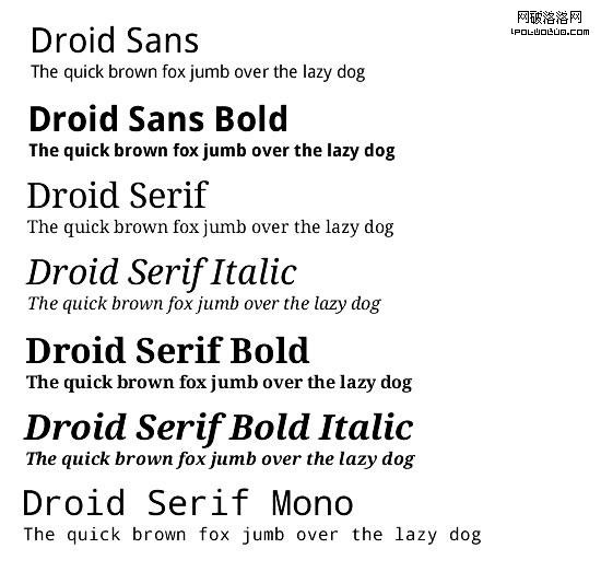你沒有聽錯,Android系統只顯示Droid Sans、 Droid Serif 和Droid Sans Mono這三種字體。不過,不要絕望,事情總有好的一面——雖然系統只支持這三種字體,但開發人員可以在他們的程序裡自由捆綁其他的字體。