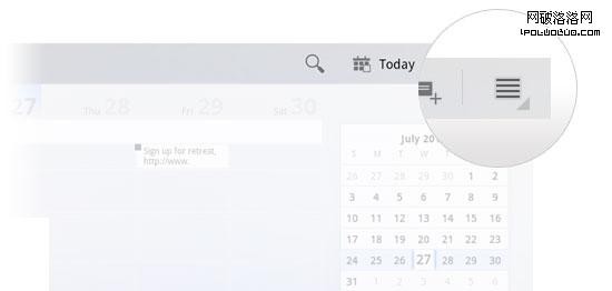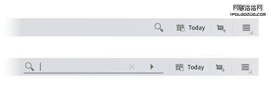 大部分UI系統的差異存在於屏幕最上方的操作欄。Android為操作欄的具體元素和視覺形式的安排提供了一些建議,包括標識和圖標的位置、導航(如下拉菜單或選項)和常用操作。這是整個蜂巢系統裡最統一的設計模式,值得你在做自定義設置或者使用iPad之類的產品之前去熟悉它。在下文中,我們將對這個常見的操作欄進行進一步的分析。