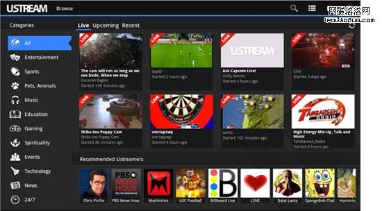Ustream的拆分視圖,類別選項在左,內容在右