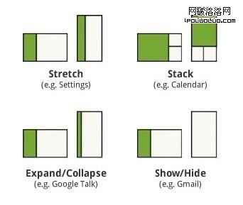 碎片是一個以一種大小適應多種尺寸的好方法,但方向策略也是很有用的。你的設計在橫向的屏幕上看起來不錯,但是如果變成縱向視圖並且上面排列了三個狹長的列表,你該怎麼辦呢?這時候你就可以選擇拉伸、堆疊或者隱藏內容。把碎片想象成一堆有彈性的拼圖,你可以根據自己的需要移動、塑造和隱藏它。