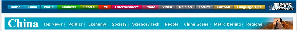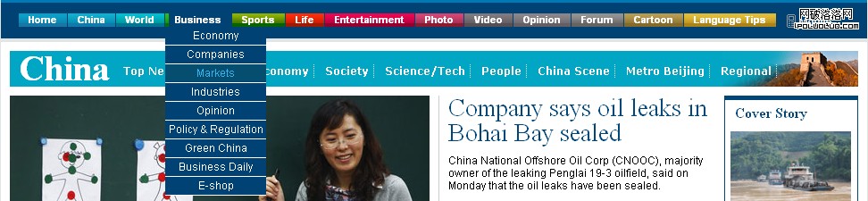 再來看China Daily,雖然不是個特別貼合的例子,但是可以說明一些問題。初始進入所看到的導航其實是最簡單的【一】字導航,最多加了個mouse on下拉功能,但依然是大模塊讓選擇有了個范圍: