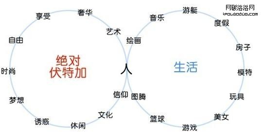 然後左邊以“絕對伏特加”為圓心畫了個圓,右邊以“生活”為圓心畫了個圓。兩個圓形的切點正好是“人”,於是,絕對伏特加、人、生活三者的關系就一目了然了。我們想要將“絕對伏特加”這圈感性的東西傳遞給“人”,並獲得“人”的認可,那我們需要將“人”的“生活”這圈他所熟悉的可以給他感性的東西進行關聯。