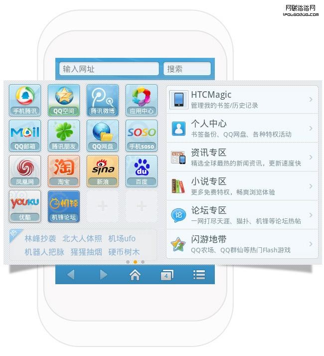清晰的信息結構和功能布局,能夠增加產品的易用性,減少用戶的學習成本,提高產品的親和力。手機浏覽器整體劃分為三個區域,最上輸入導航區,中間內容區,下方菜單區。同時集中信息在內容區展示,提高用戶操作效率,一鍵直達內容。左右內容自成體系,無縫連接處理,增強滑屏體驗。合適的灰度與色彩對比度,減少用戶的視覺疲勞,增加可讀性。