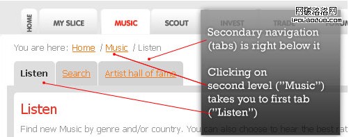 在上面的例子,SLICETHEPIE 網站讓用戶有太多的導航選項。 (1)(2)面包屑導航(3)輔助導航主導航,非常接近。在此應用程序的痕跡線索,因為坐在下方的較低級別的頁面的二級導航,沒有使用戶更加方便。此外,在面包屑導航(“音樂”)第二級鏈接上點擊帶您回到第一個選項卡(“聽”),錯誤地認為,第一個選項卡上一個更高的水平比其他兩個是(“搜索“和”成名的藝術家 “)。