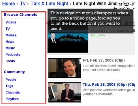 在上面的例子,MEFEEDIA不提供一個觀看影片的主導航菜單。雖然有文本頁腳部分中的鏈接導航,但沒有導航菜單在頁面的內容部分,使得它難以浏覽到網站的其他部分。