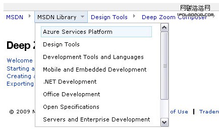 MSDN的面包屑導航。 打開一個可滾動的子導航,列表的用戶將鼠標懸停在鏈接。