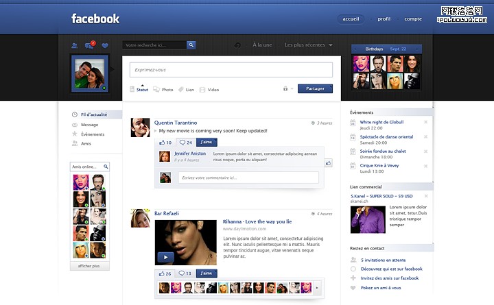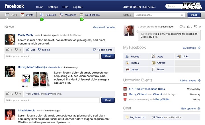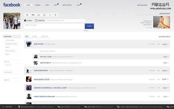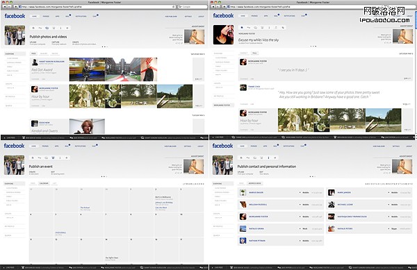 這是一個完成於2009年的項目,由設計師Barton Smith自發完成,其設計目的是挑戰facebook原有的形式和功能。整個設計使用黑白灰+fb品牌色藍色點綴,顯得干淨優雅,專業成熟。