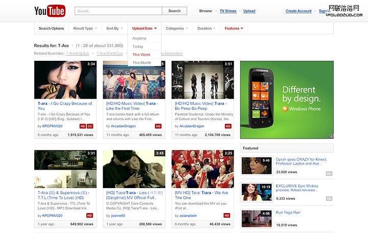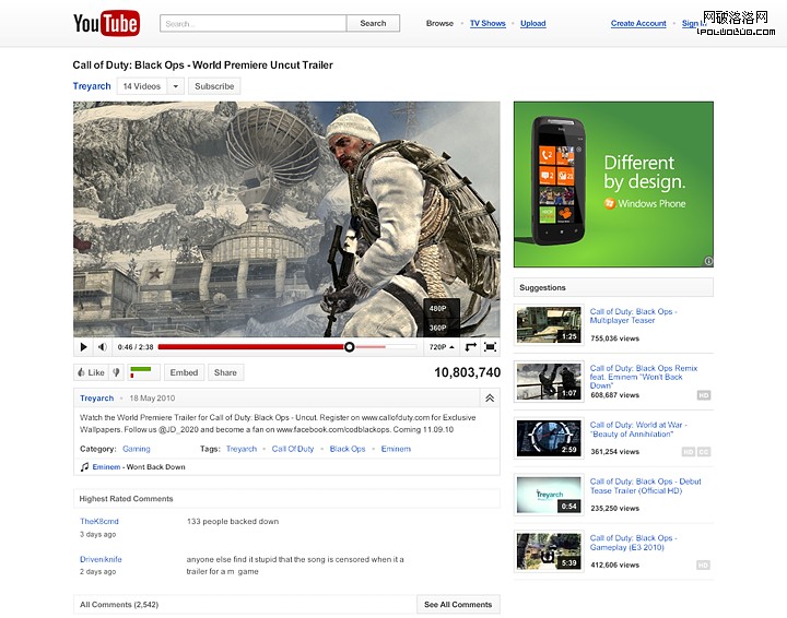 YouTube再設計的第一步是進行簡化,去掉使用不足的功能,清理界面元素,以便使用戶的注意力集中在視頻上,而不是周圍的細節上。如下圖。評論間距也進行了調整,鼠標hover後,操作才出現。另外,整站的頭部配合google產品,加入了細微的灰色漸變和google的鏈接藍。