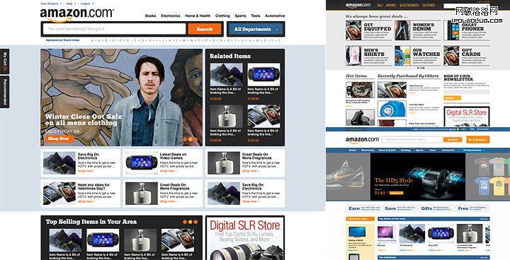 設計是為了解決問題而存在的。Amazon的問題同樣也是信息過多,導航類目繁多,圖文混雜。它使用的流動布局(fluid)適合於小屏幕,而在越來越多的大屏幕、寬屏幕上看起來就顯得留白過多,排版更加混亂難以閱讀。因此設計師提出了以下幾種方案。