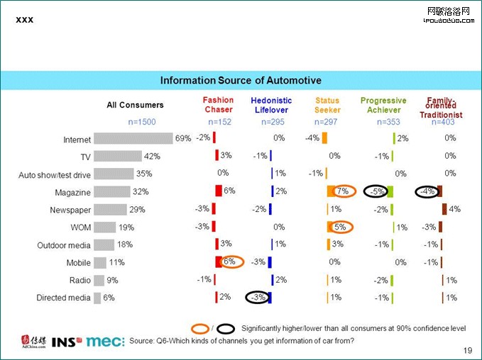 這五類消費者在收集汽車相關資訊時所用的媒介也迥然不同。由於這份報告是基於過去3個月中浏覽過汽車資訊的網民的網上調查,因此不難想象他們在互聯網的使用率上有所偏重,高達69%。電視(42%)和車展/試駕(35%)在作為汽車信息源上居亞軍和季軍。潮人型消費者更喜歡使用手機上網來浏覽汽車資訊。炫耀型消費者在口碑和雜志的媒介依賴性顯著高於平均。與之相反的是,奮斗型和居家型消費者不太會從雜志中尋找汽車資訊。