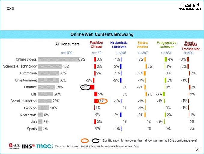在上網浏覽行為方面,潮人型消費者更喜歡浏覽社交網站上的內容,而較少看財經類網站的資訊;享樂型消費者的網上浏覽比率總體都低於平均;奮斗型消費者更偏愛視頻類網站;居家型消費者比其他類型人群更喜歡財經類內容。