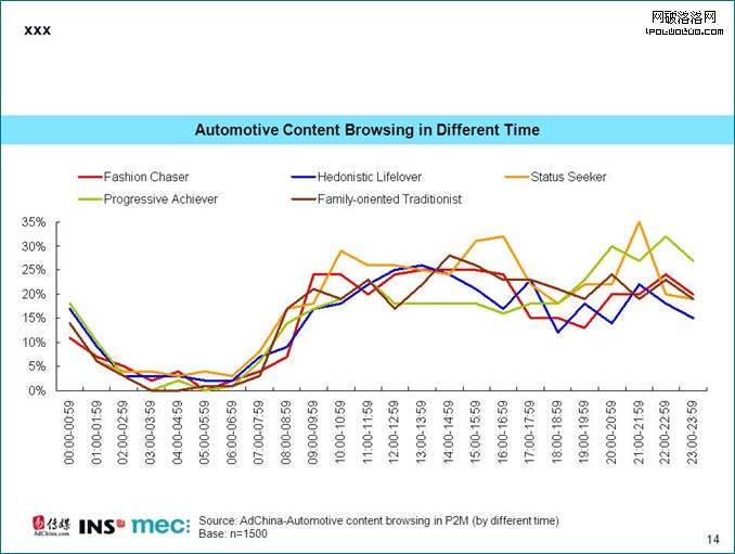 汽車類資訊網站的浏覽高峰期也因人群而異。炫耀型消費者整體上比其他類型的人群更願意浏覽汽車相關的內容。早上10點至11點之間、下午4點至5點間和晚上9點至10點間是他們的浏覽汽車類資訊的黃金時間。奮斗型消費者則傾向於在晚上浏覽汽車相關信息,汽車資訊浏覽量在晚上8點到9點,10點至11點到達高峰。