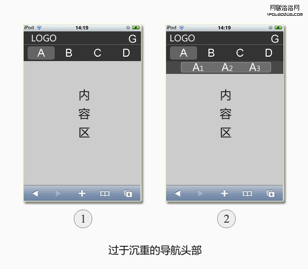 Safari浏覽器的工具欄將一直占據著屏幕的底端位置,全局導航只能被動移動到屏幕的頂端位置。這是影響Web App導航設計的最重要因素。