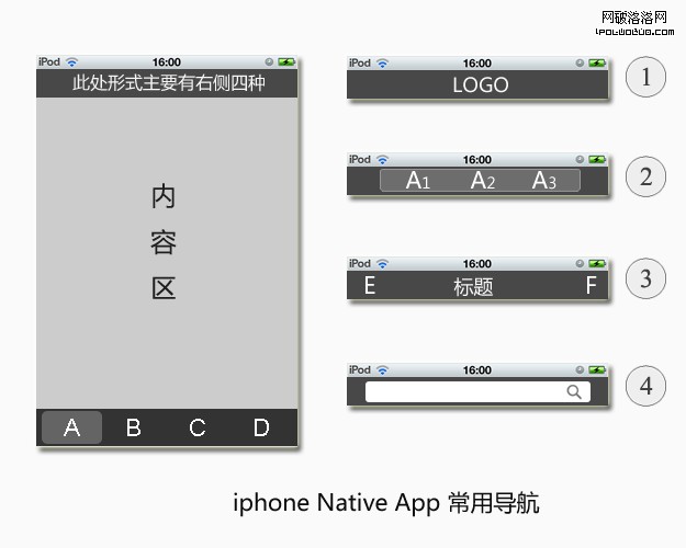 手機屏幕底端:A、B、C、D四個tab組成該Native App的全局導航,這是我們經常見到的tab導航欄。