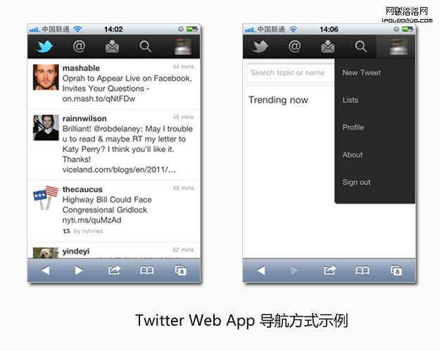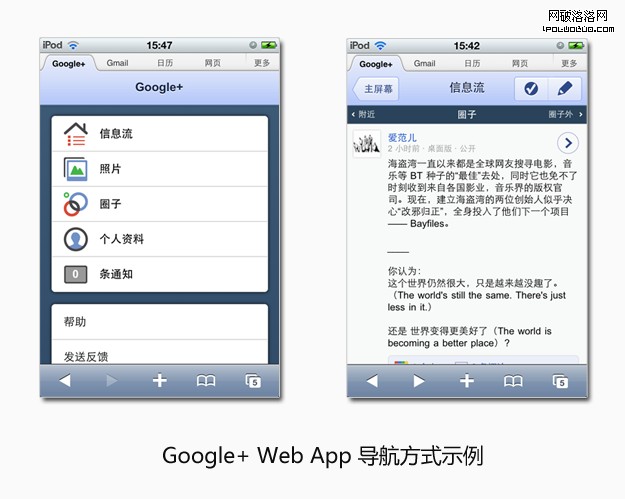 首先,分析對比了三款優秀的Web App:Google+、FT Web App、Twitter的導航方式。浏覽環境均為iphone Safari浏覽器。