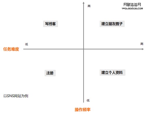 確定新手任務之後,對任務的特征進行分析。我們從兩個維度來分析一個任務:任務難度和操作頻率。下圖是以SNS網站為例,列舉了4個任務,分別對應了4種不同的任務特征: