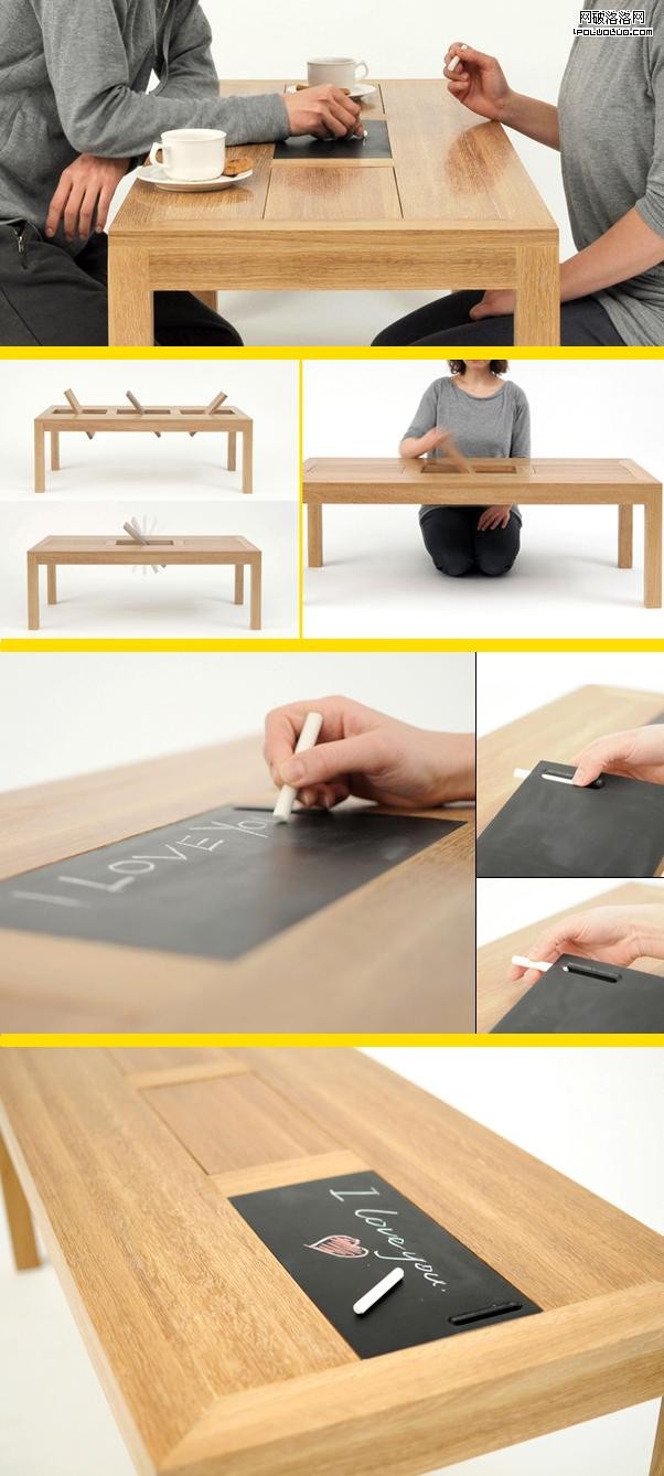 這張桌面上可以寫字的「塗鴉咖啡桌」讓通常於桌子兩側所進行的對話增添了二度空間的互動感和樂趣。位於桌面上的三片木板翻面後即是黑板,還有放置粉筆的隱形凹槽。我覺得這項讓一件簡單物品的外型變得繁復的設計相當有意思,而且它絕對是個可以用來「破冰」的好話題!