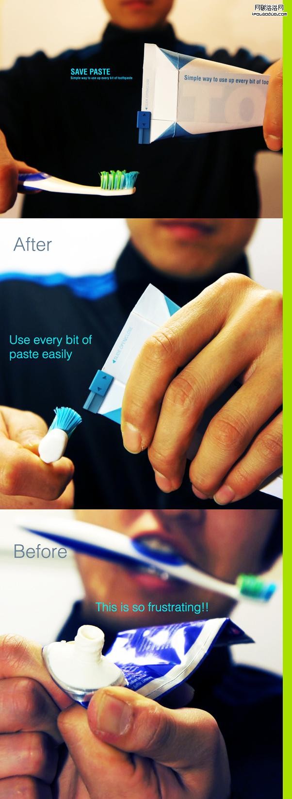 這是另一個有趣的牙膏包裝設計,非常有意思 。三點創意:消除硬擠壓死的空間,盡量減少容器內的底部牙膏殘留,減少包裝的使用 。這意味著我們可以減少浪費和制造的價格,再加上鼓勵回收。一個環保低碳、清潔,簡單,巧妙的友好設計,我們很樂意去使用它。
