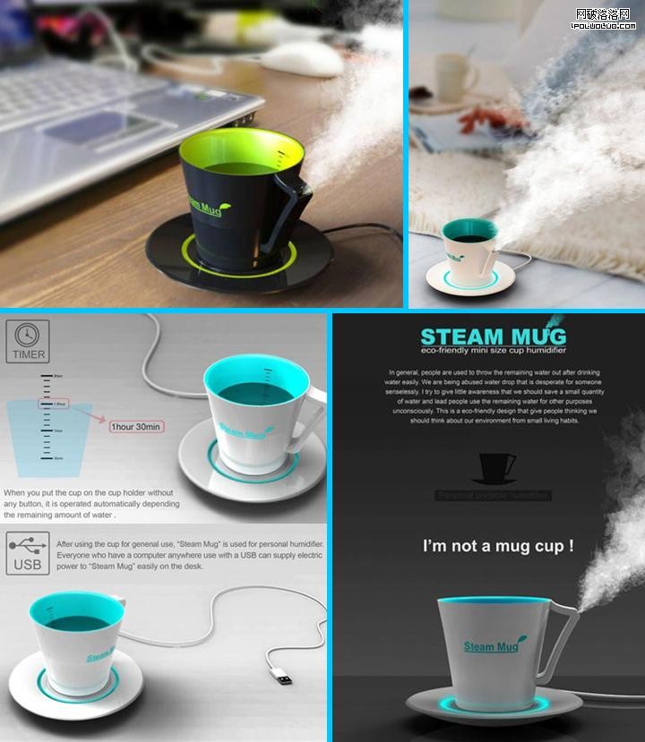 在杯子喝不完的水怎麼辦?倒掉麼?設計師告訴你一個好的解決方式。把杯碟中的USB線插上,讓水杯變身為一個加濕器。非常的適合這麼炎熱的夏天在空調房使用電腦的人使用哦。