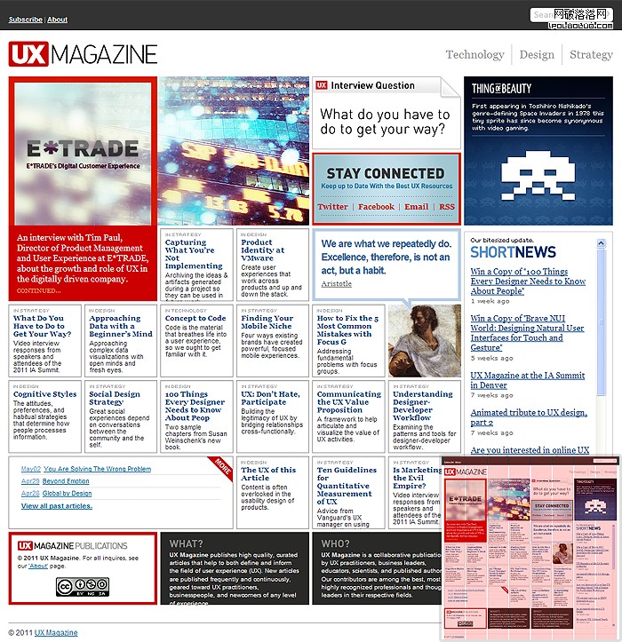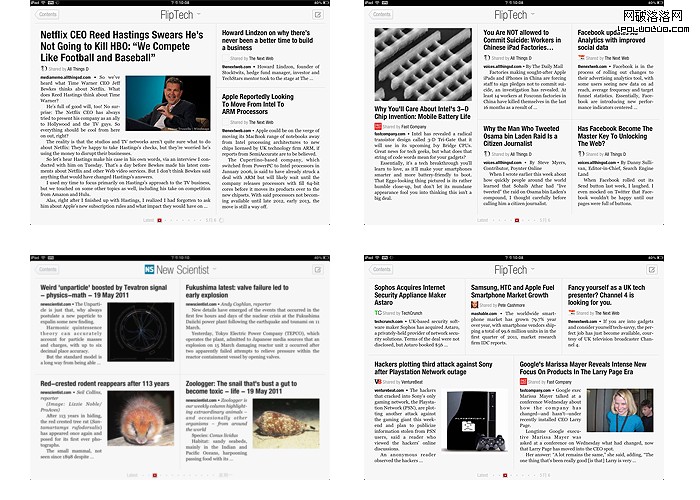 隨著大尺寸屏幕的出現和普及,很多網站開始走寬屏路線,但是這並不影響柵格系統的存在,相反,柵格系統已經成了多媒體信息排版的基礎。而在移動端,隨著flipbord應用程序的出現,借鑒雜志排版效果的信息呈現方式逐漸成為PAD上內容應用的主流形式。其中3×4網格的應用最為廣泛。