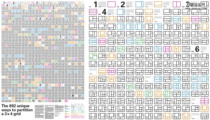 3×4格形成的矩形,可以劃分出892中不同的單元形式。多年來,設計人員使用網格,使得內容的呈現方式不重樣——書籍,雜志,屏幕以及其它很多領域都是這樣的,同時變化多樣的布局也非常美觀。 3×4格是一種常見的例子。然而,即使在這個簡單的例子,也生成令人難以想象的多種形式。Patch Kessler用算法生成了下面的大圖表,不僅為3×4網格,而且對任何n×m的網格。