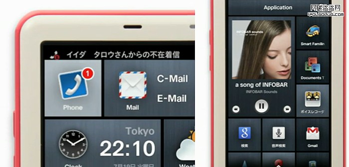 iida INFOBAR A01手機界面設計也延續這種設計思想。在手機的演示視頻中,深度定制的Android手機將首頁變成了應用模塊的拼圖。