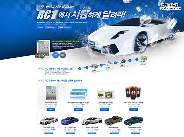 上圖,將賽車在賽道上疾馳的場面置放到頁面上作為背景,虛化的大城市,放大的賽道,飛奔的賽車……就像此刻坐在電腦前玩賽車,左手正緊緊按著W、A、S、D鍵一樣。讓用戶身臨其境,完全抓住了對方眼球。