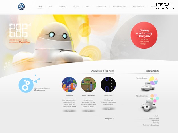 上圖中,大眾的logo和焦點圖中的機器人產品,全部由曲線組成,這種情況下,用曲線來分割背景和焦點就顯得理所當然了,畫面中曲線合理的運用也提高了層次感,機器人和紅色標題都更突出。