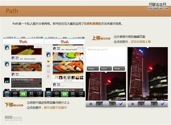 交互有一個可怕的定律叫“漏斗法則”,意思是盡量減少操作步驟和界面跳轉,每增加一個操作步驟或者界面切換,就有可能流失10%的用戶。位移與信息疊加的設計模式,在不跳轉的情況下,通過內容移位,能夠合理展示更多的信息,扁平化信息架構,在操作者產生交互的地方,就近通過這種方式就完成了輕便的操作。Path、with/、myPANTONE便是通過內容移位與信息疊加的模式來展示信息的比較有趣的軟件。