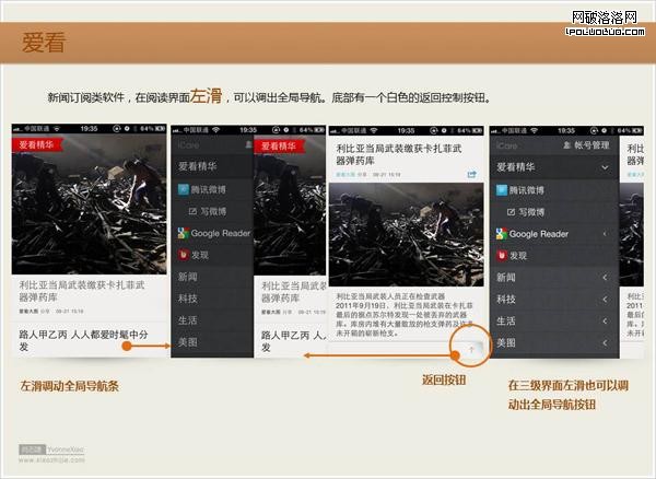 任何時候有一個全局的導航條,能夠快捷導航是一個設計理想。但是對於有第三第四第五層級的應用軟件來說,在次級頁面有個固定的位置擺放全局導航,不免有點影響其它操作任務,愛看給出了解決問題的一個很好思路,可以放置於左側,通過向右滑屏展開,既不影響子頁面的操作任務,又能夠解決全局導航問題。