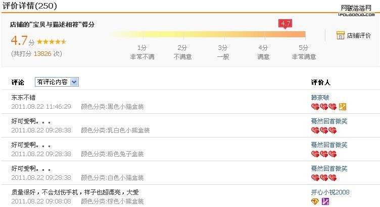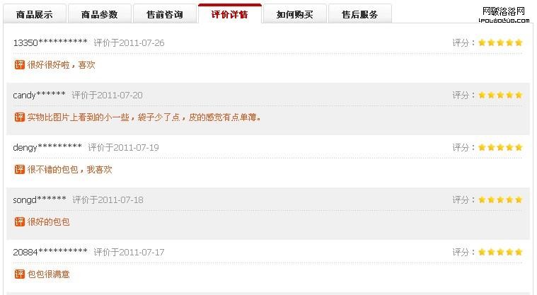 這種評論模塊,給出了每種商品的綜合評分,可以在整體感知到商品的優劣。如淘寶、當當、紅孩子、麥考林,都采取了這種形式。不過每個網站也都有些自己的特點。