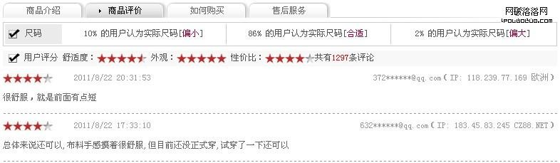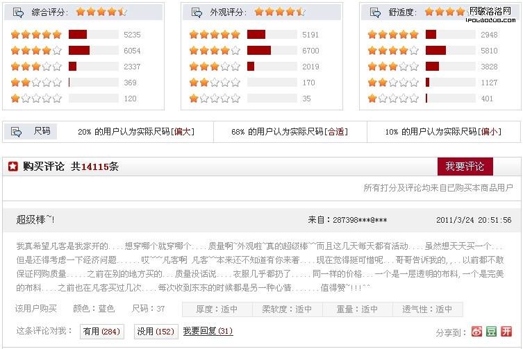 最典型的例子就是凡客。將評分細分為外觀評分和舒適度,每一項都有一個總體評分還把評分的分布也列了出來。在尺碼方面,也有特別的強調,對於服裝來說,不能試穿如何選到合適的尺碼,這一點的強調也是很有價值的。