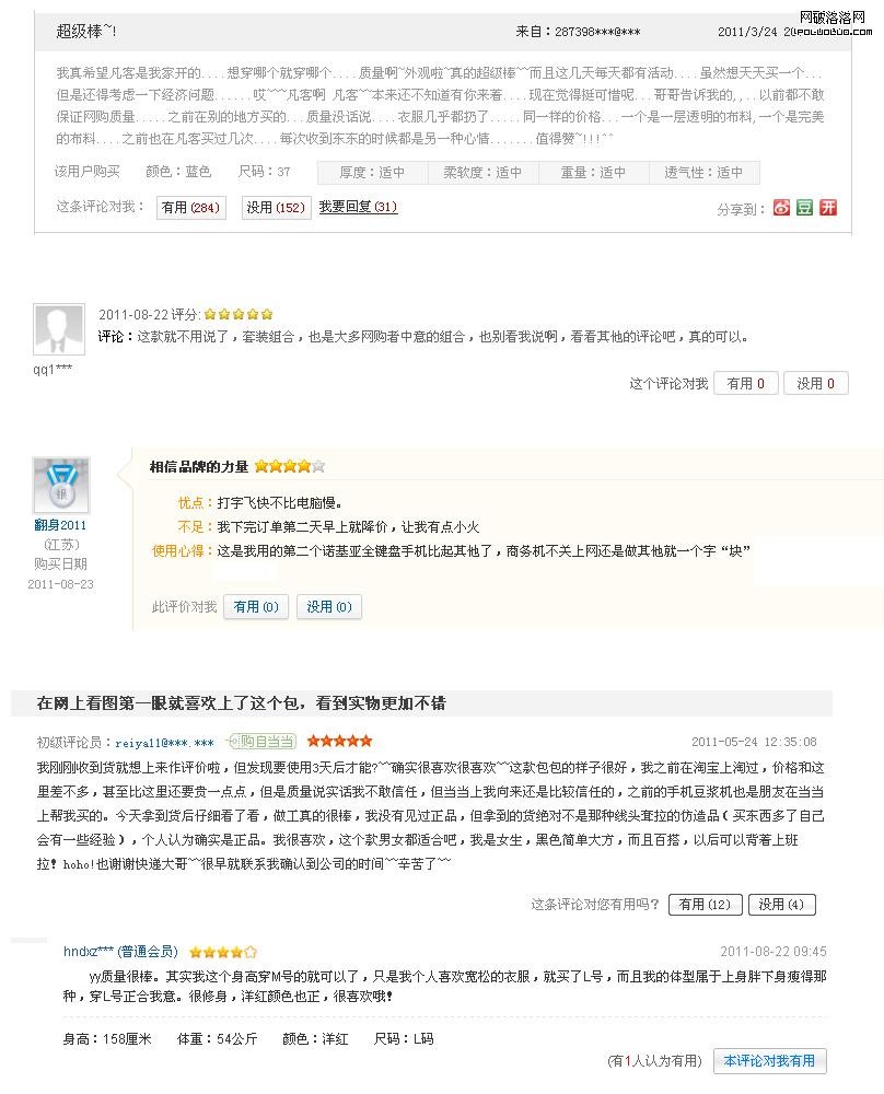 麥考林作為重點做女裝的網商,在每條評論後都列出評論者的身高、體重、選擇的顏色和尺碼,這些信息給之後想購買的用戶很大的參考價值。