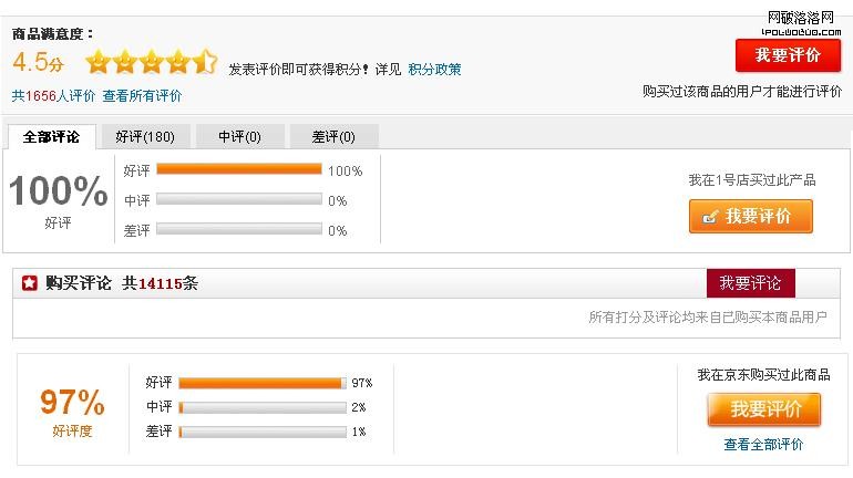 京東和一號店把好中差評的百分率也展示出來,比星級評分更加直接易懂。