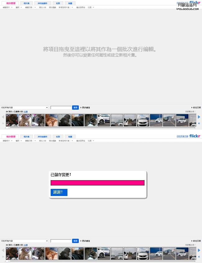 此外,在Flickr批量管理的界面中可以發現,除了等待過程的動態效果,更多的是,在鼠標經過可操作的位置時,動態效果暗示著區域中有可操作的元素,同時也暗示著如何去操作。