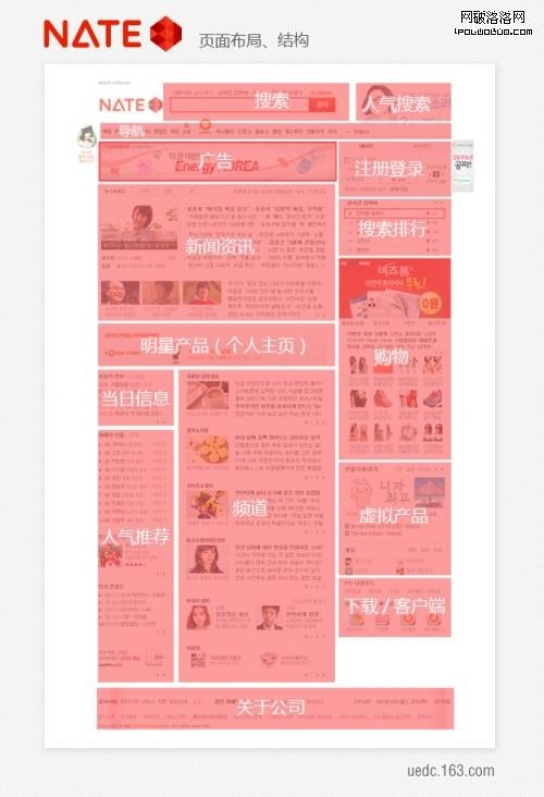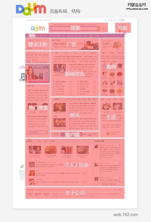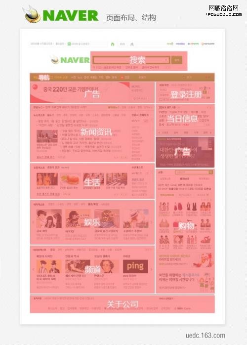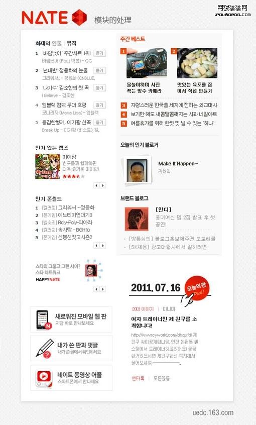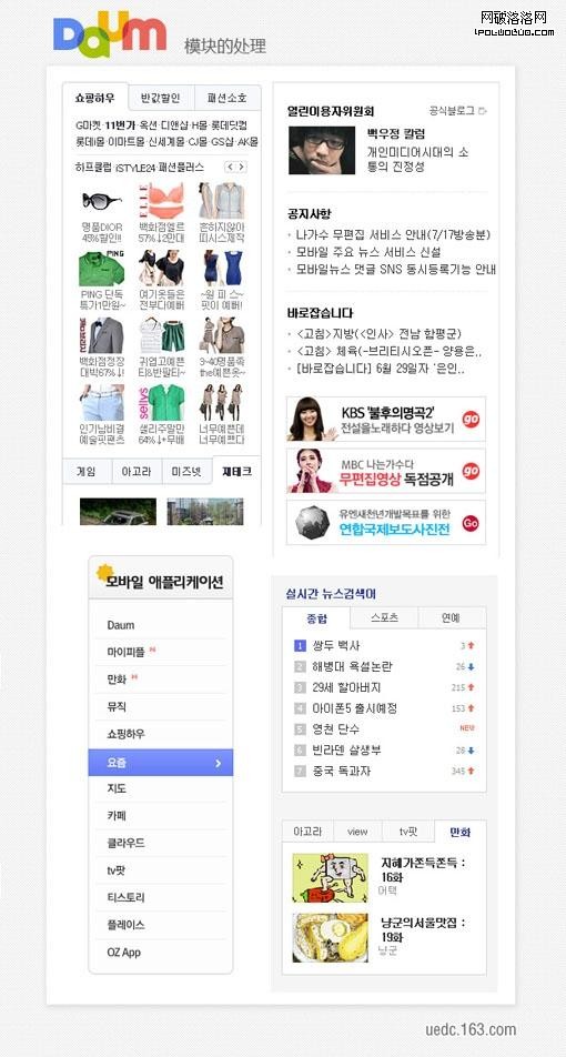 以上三個門戶的首頁頁面布局和結構中可以看到比國內的幾個門戶網的布局大不一樣。韓國的首頁布局通常都是以簡潔清晰、區塊明顯的的特點吸引用戶。但這並不意味著內容上單一、乏味。韓國的門戶更多的是利用清晰的導航來引導用戶更快、更直接的到達用戶所需要的頁面中,而不是把全部的頻道、分類羅列在首頁。記得曾經在一位韓國設計的博客上看到過他寫的一段話,講到:用戶預覽網站就像逛商場一樣,商場不一定為了大賣把所有商品堆積在顧客進門的大門口處,而更重要的是怎樣讓用戶少走一些彎路,買到更多自己滿意的商品,這就需要一個清晰明了的導航和合理科學的布局。