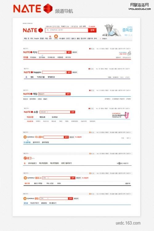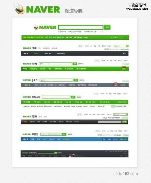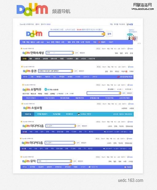 以上三家門戶的頻道導航處理上略微不同的是NATA任何頻道白底黑字,只是用分別不同的細的色條來區分頻道之間的差異。NAVER和DAUM用的是VI標准色,和應用頻道的特點取了一些周邊補助色。但任何頻道都沒有脫離VI的標准色,這樣處理的好處是很好的體現了其品牌的凝聚力和品牌旗下的概念。