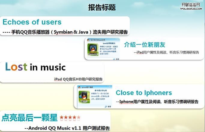 來到騰訊以後,做過iPhone閱讀器、iPad閱讀器、iPad音樂播放器的用戶理解,目前正在做iPhone QZone的用戶理解工作。做得次數多了,方法在不斷改進,也積累了一些經驗,與大家一起分享,希望幫助我們更了解用戶。