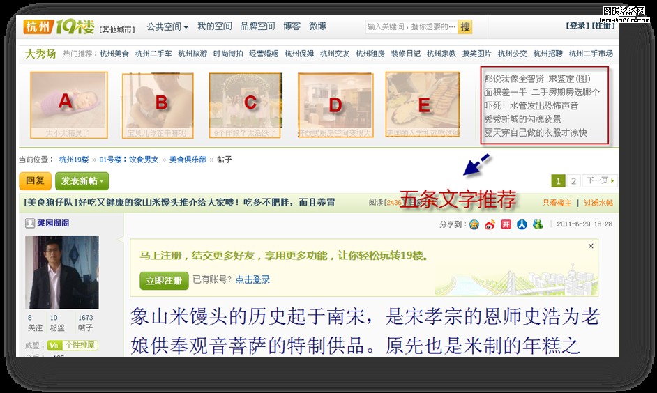 貼內廣告,每一個帖子內頁的頂部,19樓有獨特的推薦專欄,五個圖片推薦位,五條文字推薦位,廣告A,廣告B因為在“回復”和“發表新帖”按鈕上方,靠近帖子標題,會非常吸引用戶注意,甚至可能讓用戶拋棄主帖,轉而點擊進入推薦帖子。這五個廣告位相對貼內五條硬廣,給用戶的感覺會更好,避免反感和影響看帖。