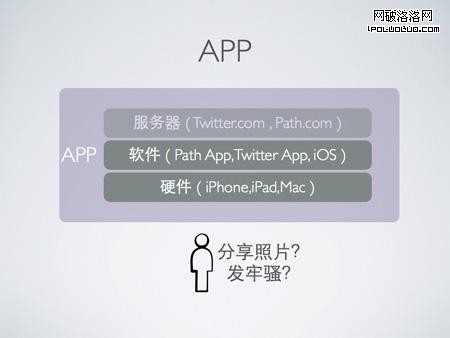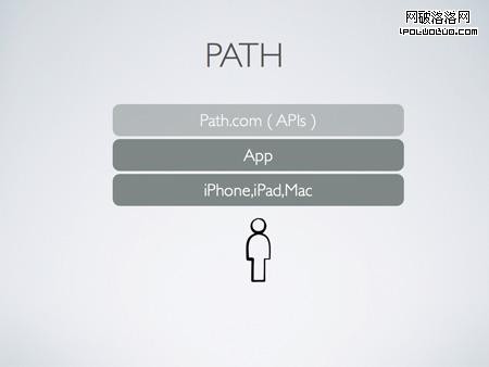 Path 就是如此。 iPhone , Path App 和其背後的網絡服務是一體的。缺少誰,都不能在我們想“分享照片”的時侯,拿出來使用這個解決方案。對 Path 來說,技術上如何分層不應該暴露給用戶。整合可能的技術,更好的為用戶解決真正的問題才是關鍵。