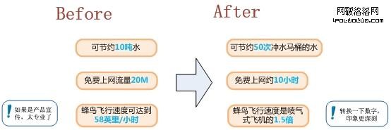 譬如說,某天下午,老媽對著兒子大聲咆哮:下午出門,不關空調,浪費了好多電。話沒說完,老媽想起來要使用數字才能夠清晰的表達信息,於是改口說:浪費了5000W/2小時的電。兒子一臉迷茫。莫非這位老媽是希望兒子先轉換出5000W2小時是10度電,若每度電5毛錢的話就是5塊錢,最後兒子算出實際是浪費了5塊錢的電。我猜這位年輕人估計沒那個閒心去計算,最終還是不知道自己浪費了多少電,以至於下次依舊會不記得關空調。其實老媽的意圖很明顯,是希望兒子明白這個行為浪費了不少銀子,讓他下不為例。所以假如老媽直接說:你今天浪費了5塊錢的電,明天從你的零用錢裡扣。估計這樣的效果會直接很多。所以當我們在使用數字時,首先要先明確這些數字是希望傳達什麼信息,達成什麼效果,再根據想要達到的效果去提煉、轉換、對比後得到數字傳達給對方,那麼這樣會比直白的使用原始數字更有效。