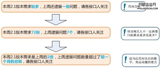 前面我們用一些淺顯的例子目的在於講述兩個核心思想,1、學會運用數字。2、學會有效的運用數字。那麼它是如何展現在項目管理或者其他相關工作中呢?案例在項目進行中,當發現項目風險時,項目經理需要將其及時暴露出來。假如需要發一封郵件,那麼你如何讓這封郵件在發出去後得到好的響應和關注?如以下案例,我的郵件是需要警示相關負責人兩個問題,1、本周需求太多。2、上周遺留問題嚴重。那麼運用我們前面說過的辦法來一步步優化,看看是不是會達到一個更好的效果。