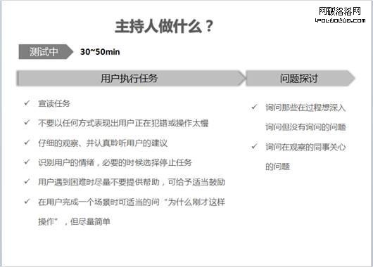因為是快速的測試,主持人從用研人員變成了產品和設計人員自己。因此,在這裡要強調的是,在測試中不要試圖教用戶如何使用產品,也不要試圖向用戶推銷你的產品。