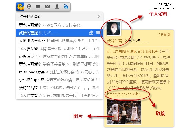 第五次升級,支持直接打開微博詳情的圖片、鏈接和個人資料。這個功能讓我等了很久,但終於是上線了,不能浏覽大圖,不能點鏈接,確實是很煩的事情,鼠標開始是根本沒法移到黃色區域去的。不過,終於,weico還是把這個功能做好了,可以看資料,鏈接,圖片。