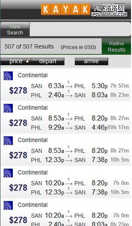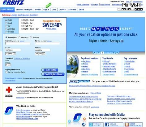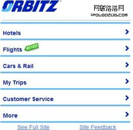 桌面站點可以有1024*768的分辨率,而智能機僅有320*480分辨率,如何在如此小的分辨率中,在不降低用戶體驗效果前提下進行設計是很有挑戰性的。桌面站點常常包涵更廣的內容,而移動站點僅包涵一些符合使用情境的主要功能和特征,如圖1、圖2所示Orbitz的桌面站點和移動站點。移動站點應該通過移動設備將用戶最需要的內容和特征展現給用戶。一些站點內容,信息架構和屏幕布局都是在深度理解客戶需求的前提下設計的。